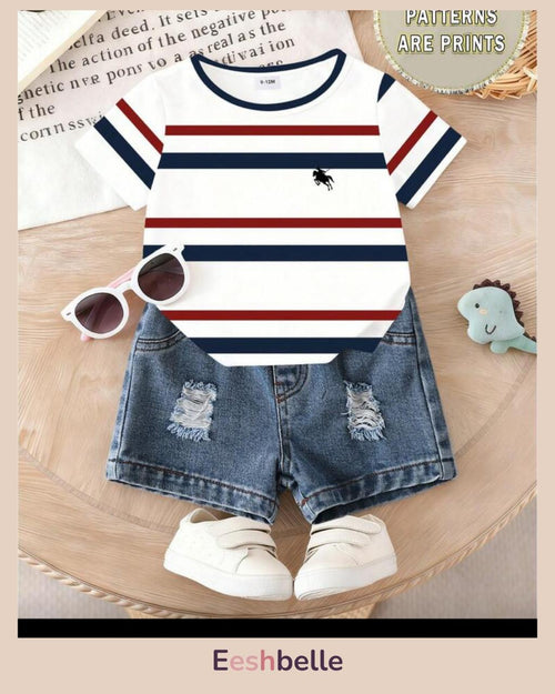 Baby Boy Boack Striped Waffle Knit Fabric T-Shirt & Shorts Set